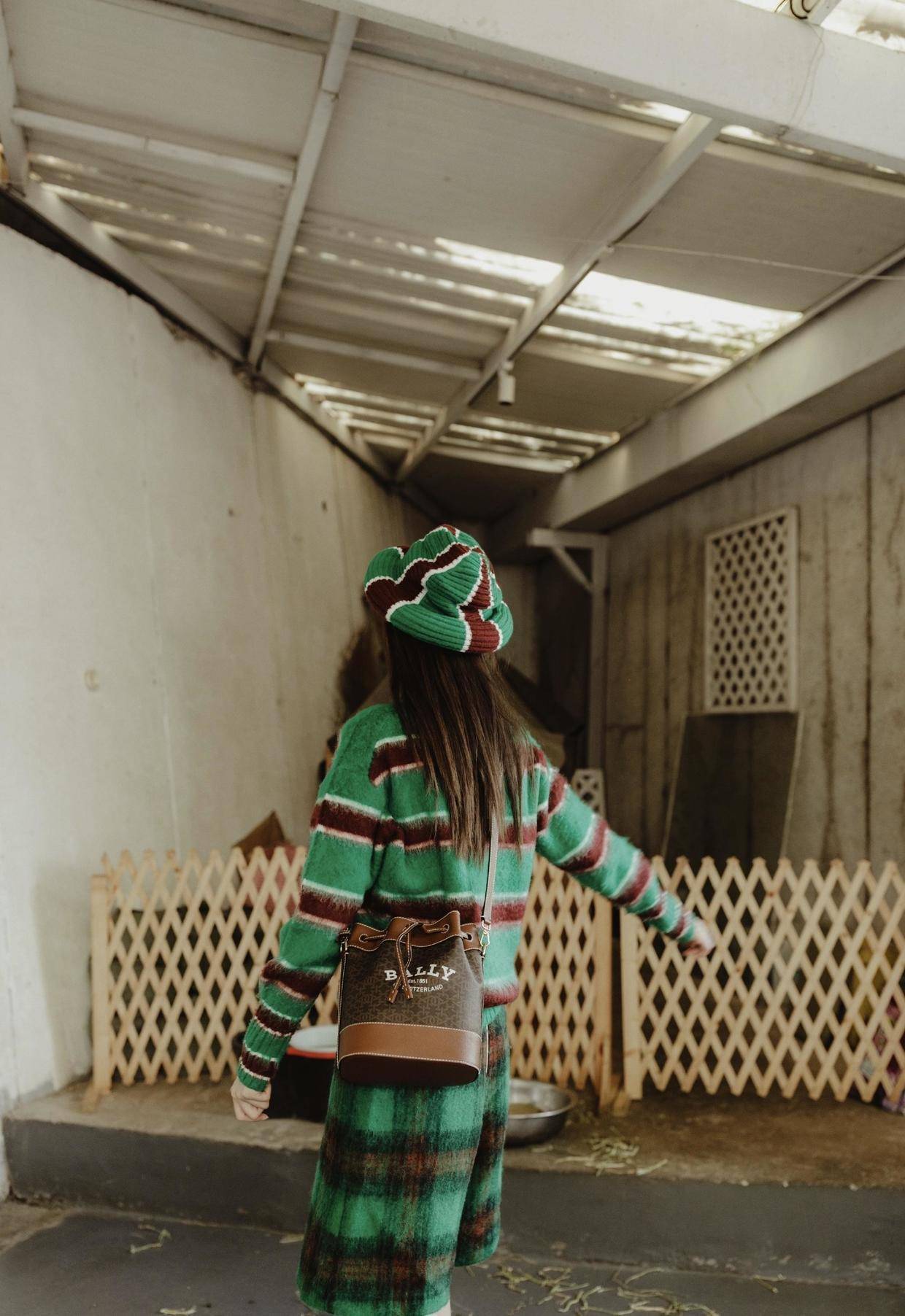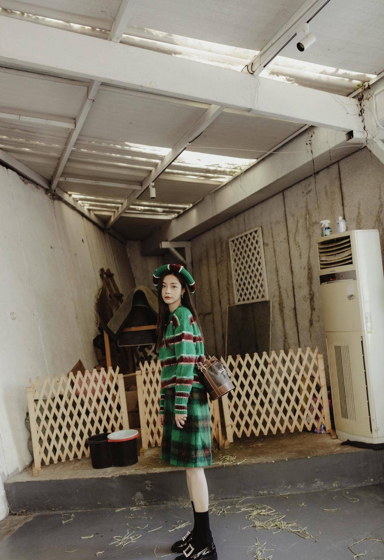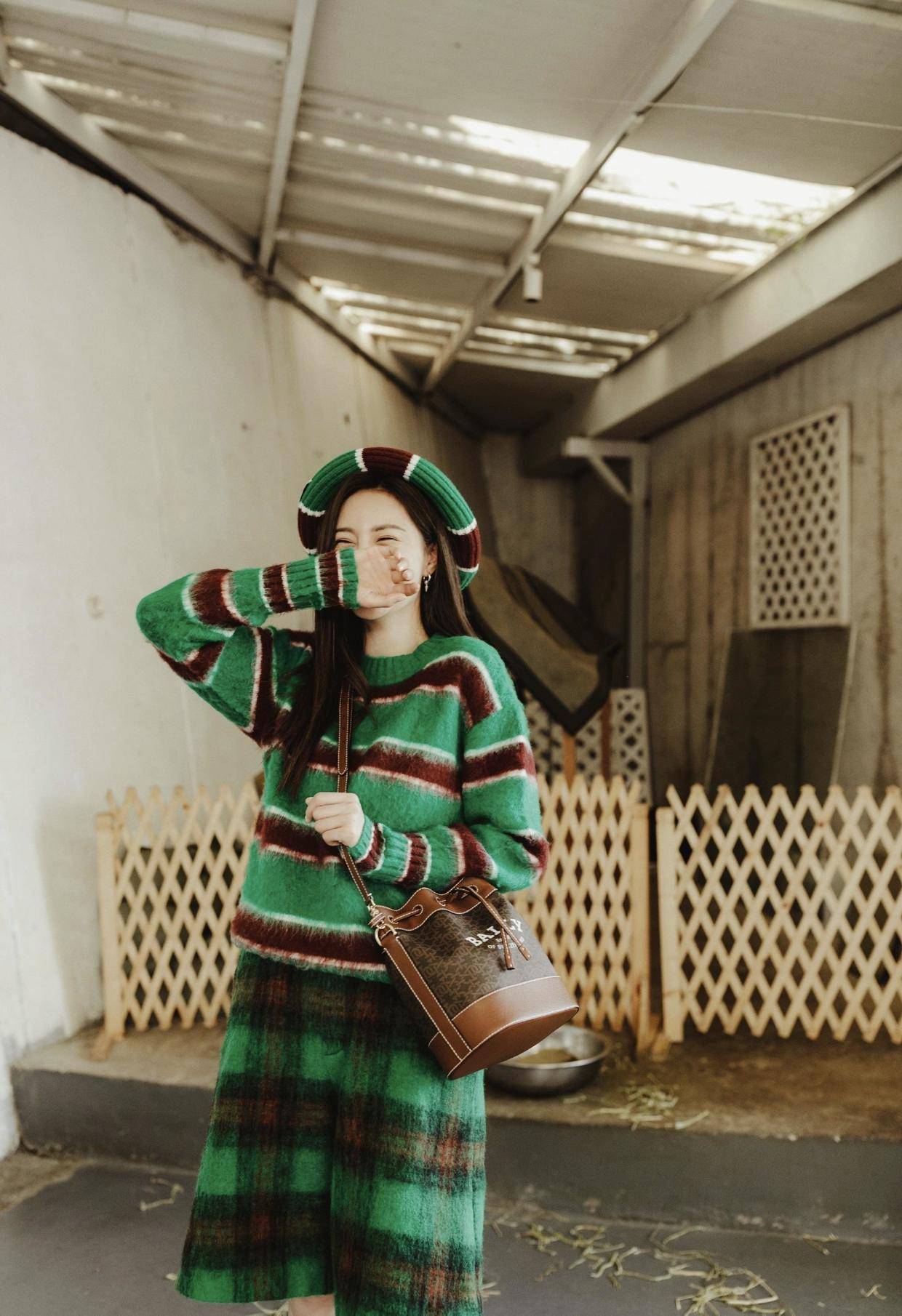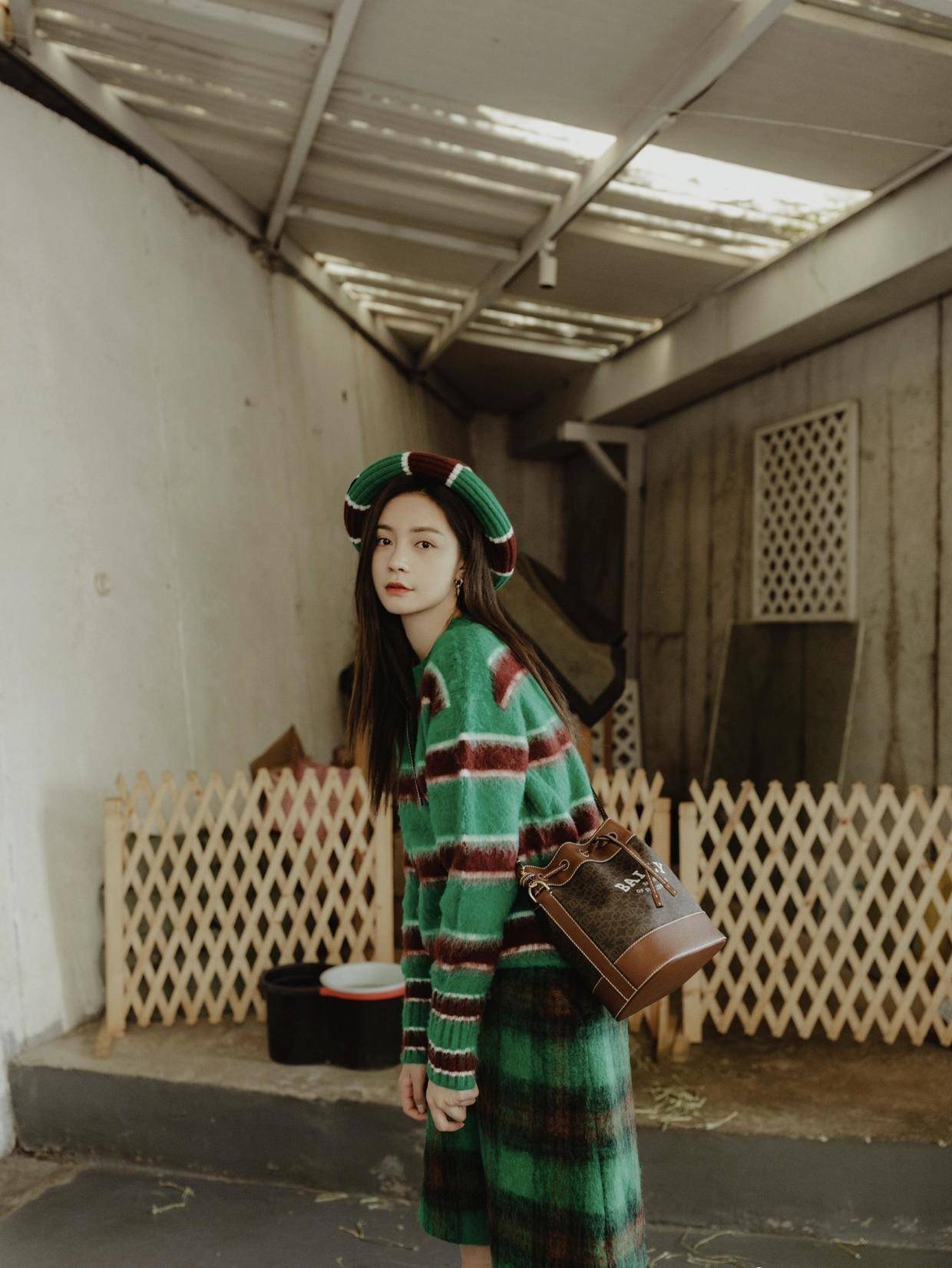 同时,沈梦辰还在自己的头上搭配了一顶绿色的贝雷帽,风格与整体是相同的,依旧是绿色为底色与暗红色的条纹,强化了整体的风格,会让你看起来更加和谐自然,还能注入复古风的韵味,太有温婉气质。